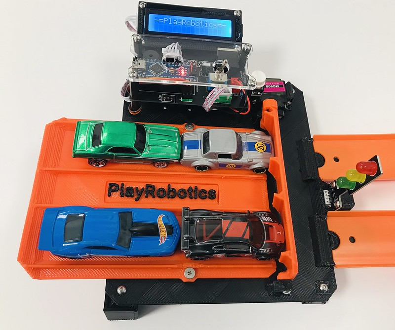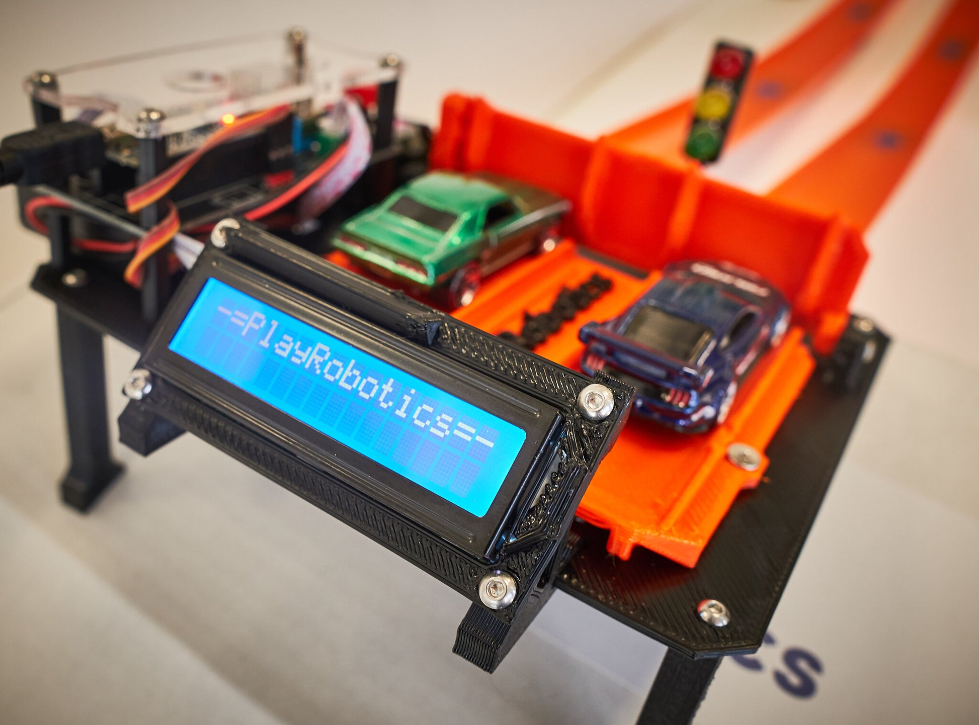 The race control unit is the most important part included in your kit. It contains a tiny computer called an "Arduino" and various electronic components, such as a motor, buzzer, LCD screen, and more. The plastic parts of the control unit are 3D printed.