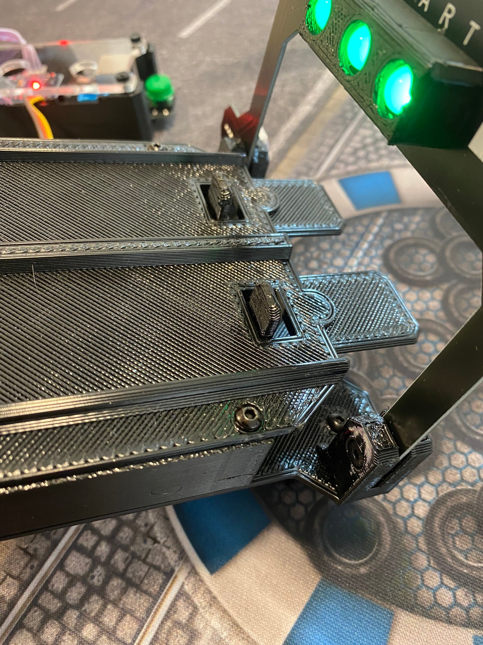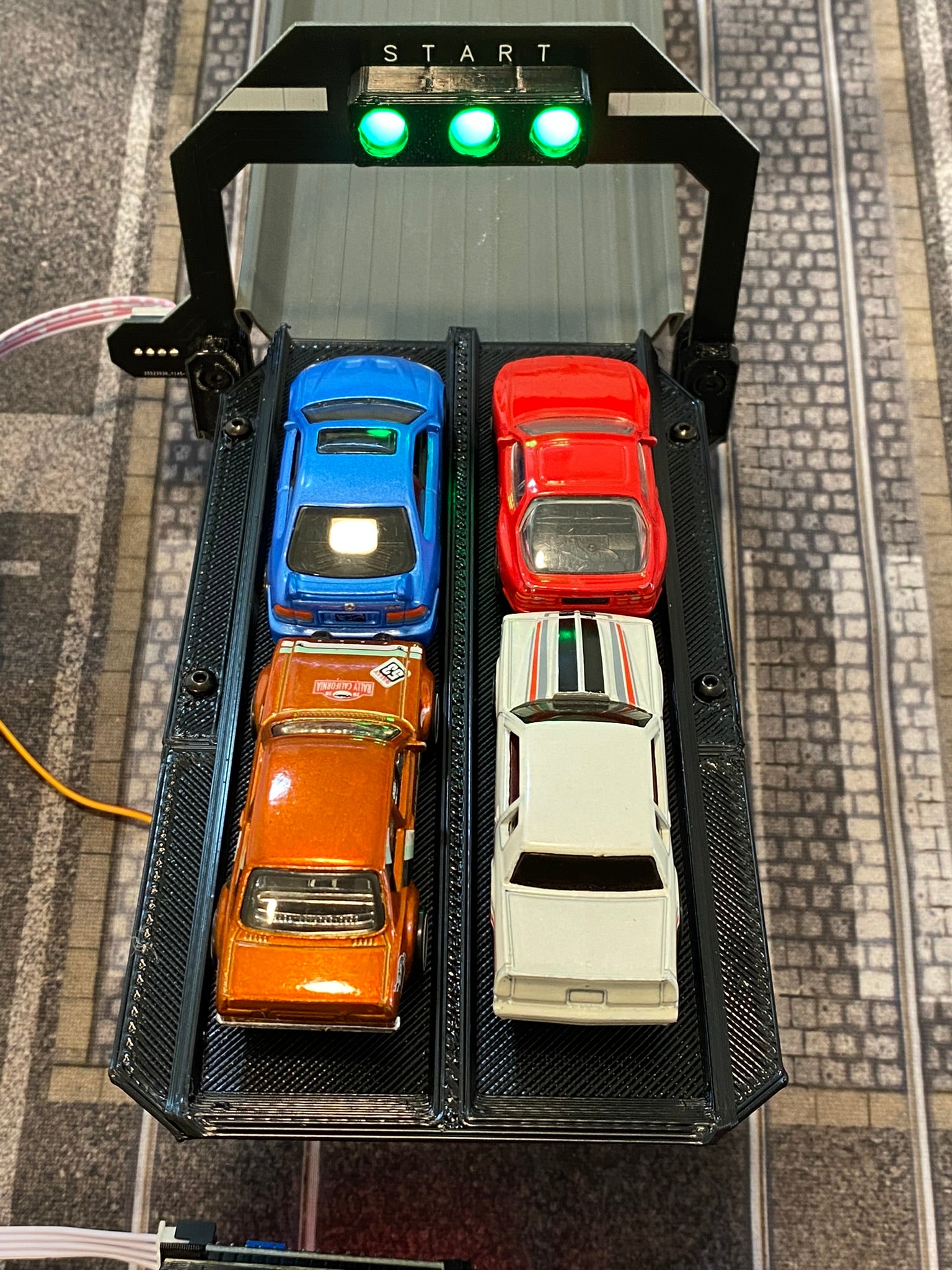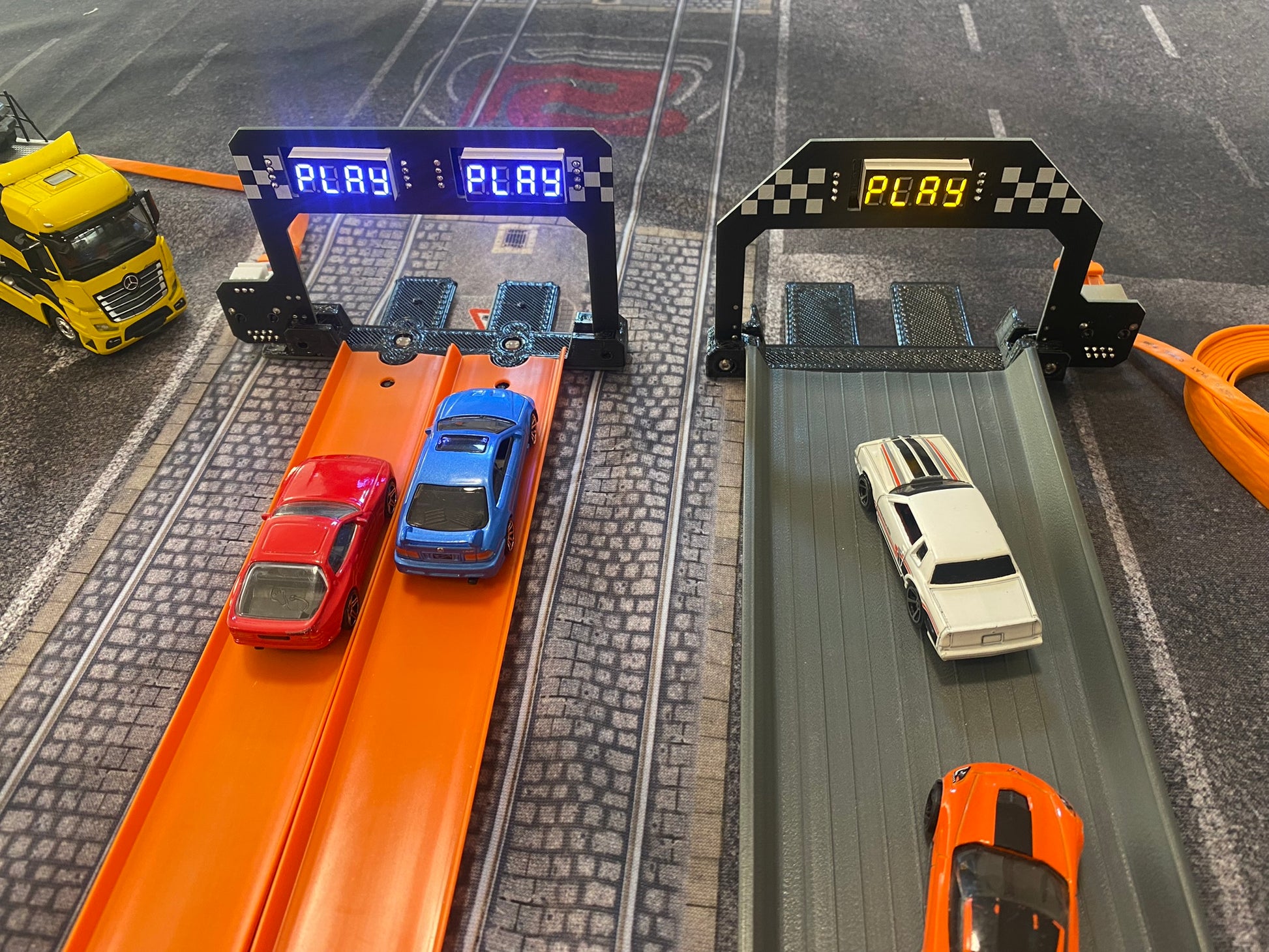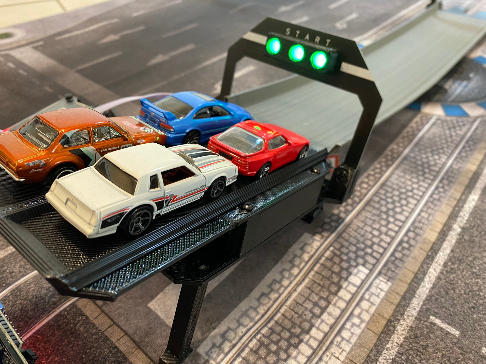 1) It is low profile, the plastic parts are 3D printed in black, the electronics are located in a separate box which is not part of the start gate, which means you can easily hide the electronics when building your track.