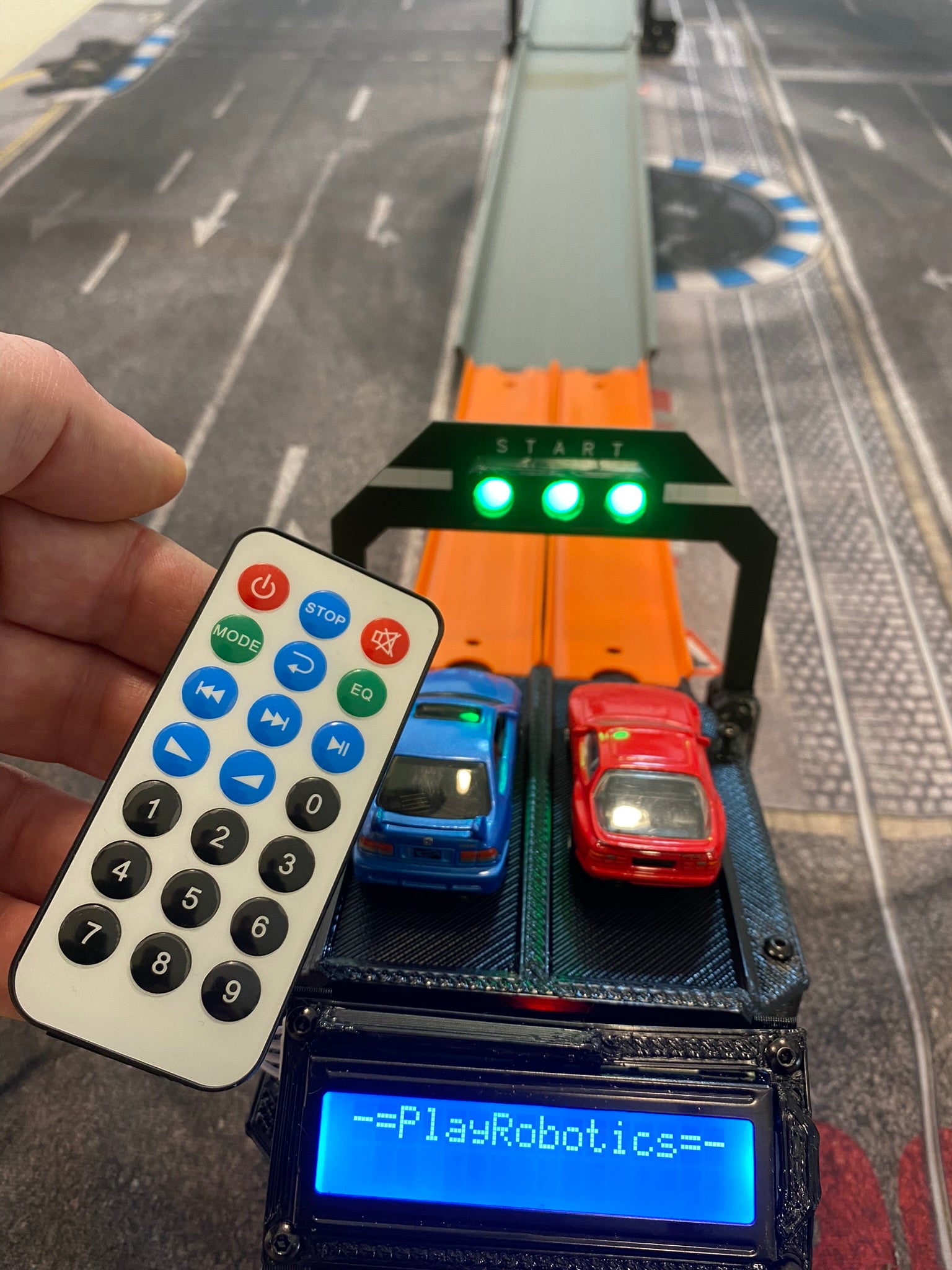 The race can be started by pressing a physical start button located in the electronics box or by using the included remote control.